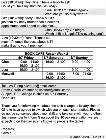 TOEIC Part 7 簡易模擬テスト2020年6月20日|By 4-Skill Master TOEIC Part 7 簡易模擬テスト Directions: In this part of the test, you will read a selection of texts, such as magazine and newspaper articles, e-mails, and instant messages. Each text or set of texts is followed by several questions. Select the best answer for each question and select the letter (A), (B), (C), or (D) on the screen. 1. At 10:32 am, what does Liza mean when she writes, “I’ll make it up to you”? (A) She will make Gina a present. (B) She is going to compensate Gina. (C) She knows what Gina likes. (D) She broke her promise with Gina. 2. What time does Gina have to show up for work on Saturday? (A) 16:00 (B) 9:00 (C) 14:00 (D) 21:00 3. What is Liza asked to do by Gerald? (A) She is not to change shifts. (B) She has to prepare the tables for Saturday. (C) She needs to tell Gina of the reservation. (D) She should not keep missing work. 4. According to the text message chain, what is suggested about Liza? (A) She has been constantly late for work this past month. (B) This is not the first time she asked to switch shifts. (C) She is from a big family with many siblings. (D) She needs to work more shifts to save money. 5. In the email, the word “notice” in paragraph 1, line 3, is closest in meaning to (A) reminder (B) attention (C) review (D) bill Time is Up! PrevNext